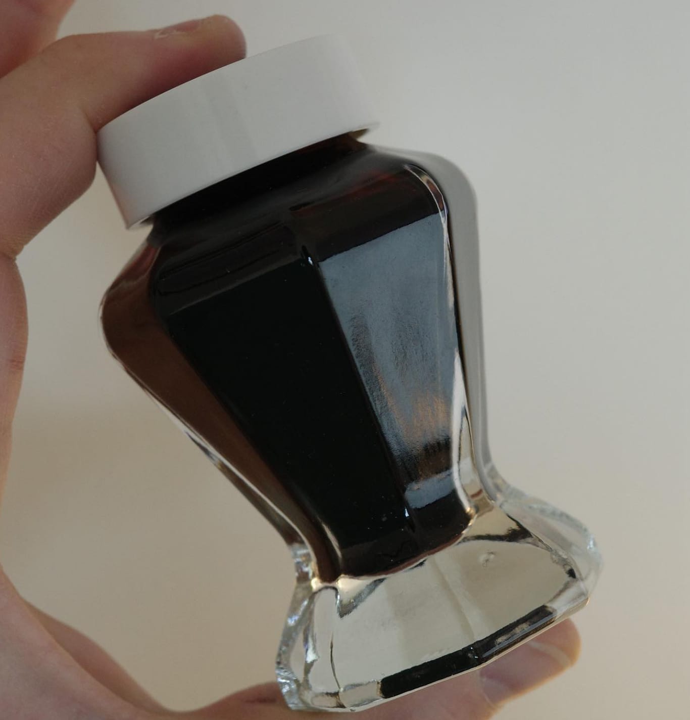 As a piece of design, these bottles are dear to my heart. The tall shape is not only pretty and elegant, it makes filling longer nibs easier. The caps seal well and come off easily (Wearingeul caps give me blisters). The tapered shape, I imagine, helps keep the bottle usable as the level drops.