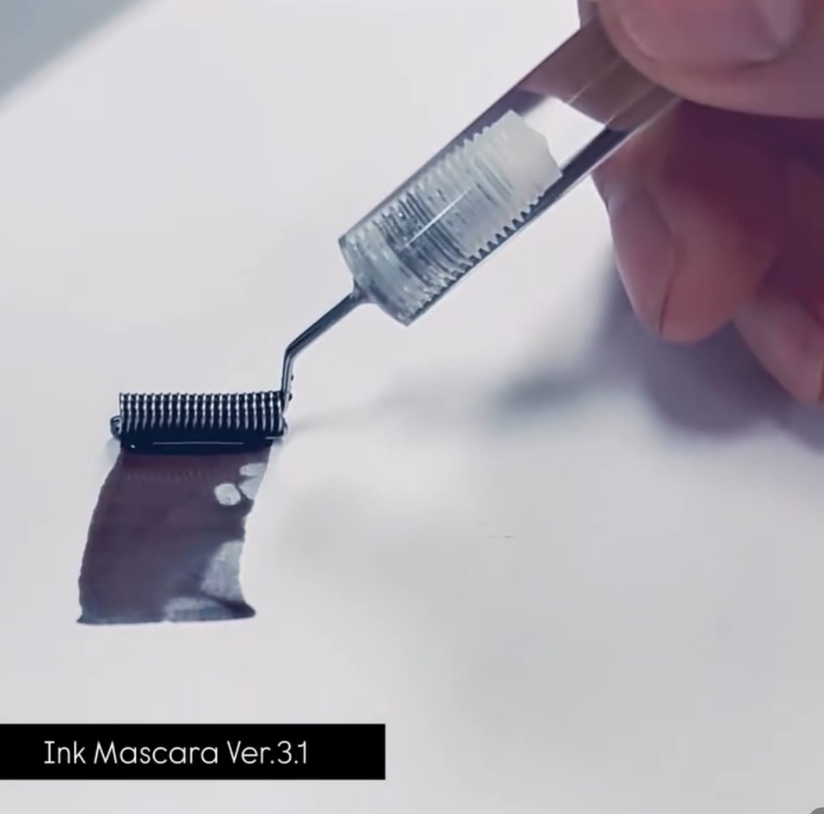 Then someone in Japan (of course) solves the problem. This is the ink mascara, and it takes advantage of the surface tension of ink to grab a bucketload for you to lay down on the page, like a crazy wire mascara brush.