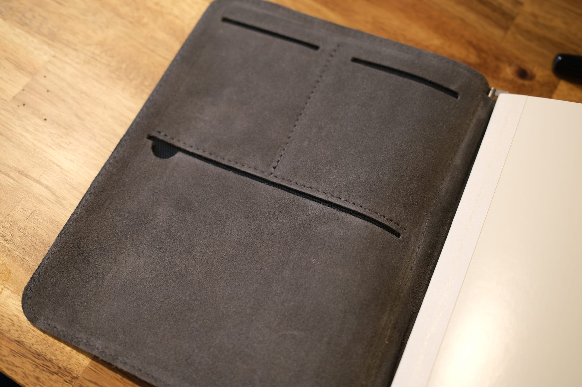 Most obviously, a proper pen sleeve that can accommodate and protect a full-size fountain pen. There are third-party products I could add, but one built into the cover would be very useful. Some RFTB models have a little pen loop, but not the one I chose.