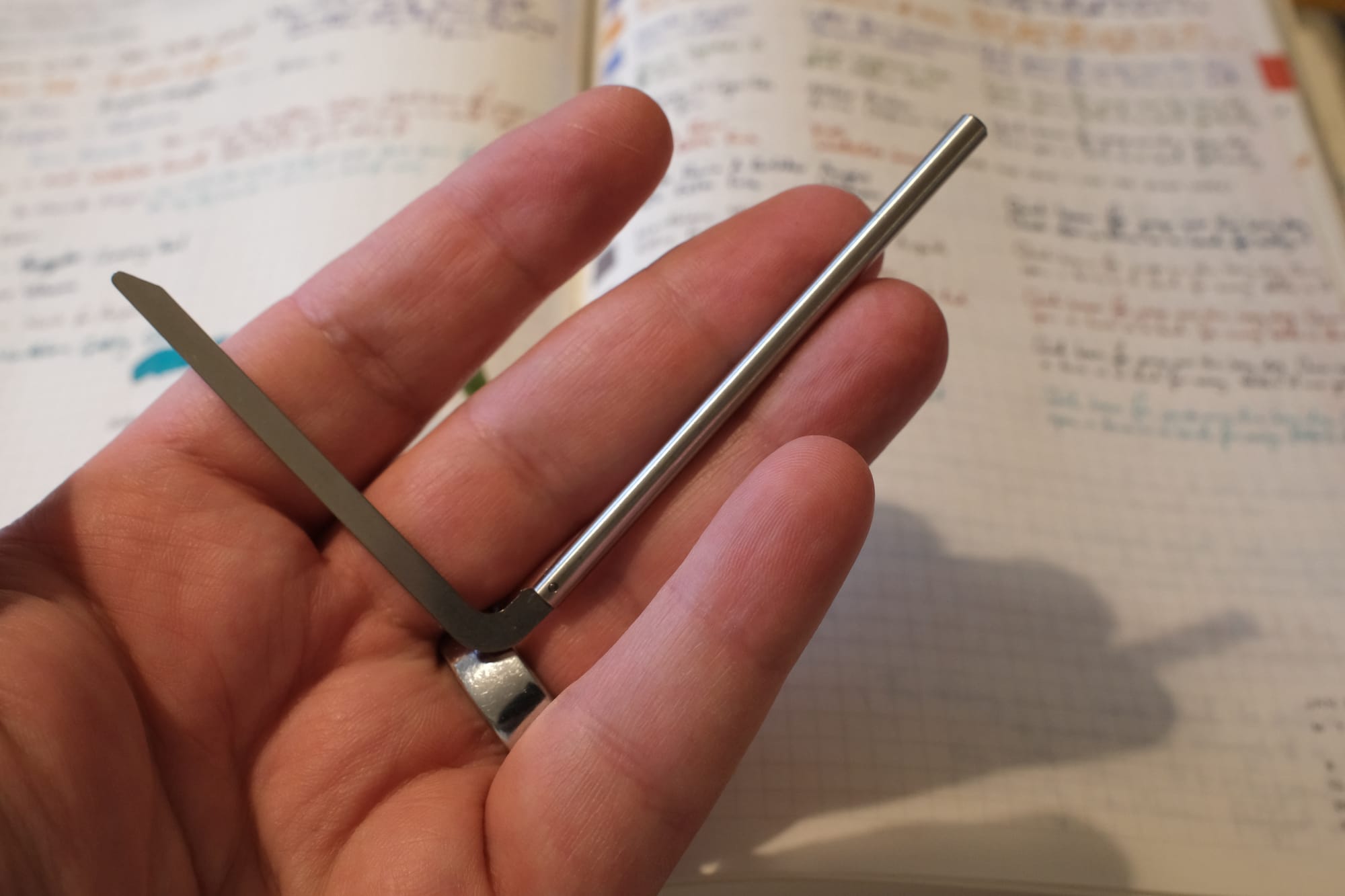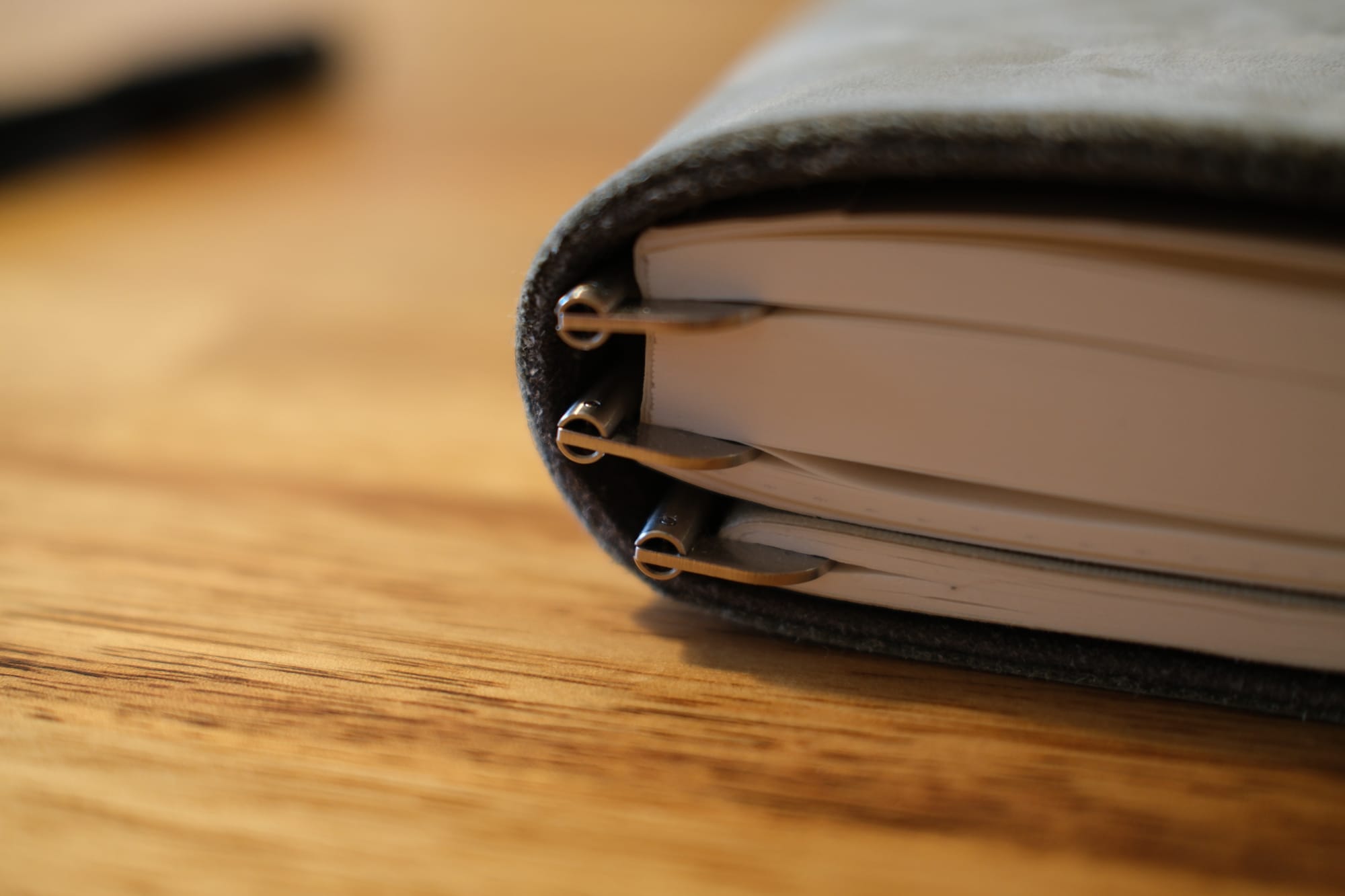 The basic idea is a thick cover that you wrap around your notebook(s). The notebooks are held in tight against the spine not by inserting the covers into pockets (like most single-notebook covers), not by an elastic band (like Traveler’s Notebook), nor by punched holes (like Plotter or William Hannah) — but by articulating metal arms that fold into your notebook from top and bottom.
