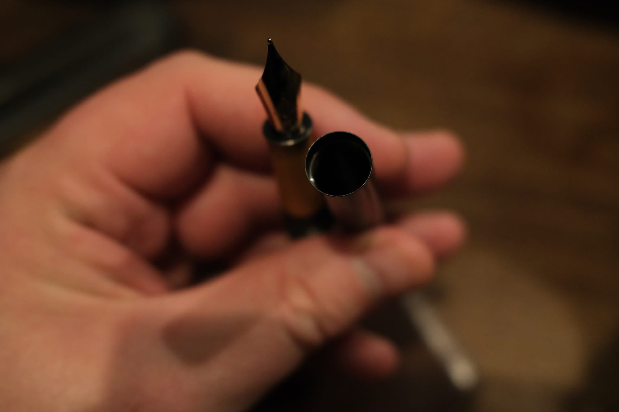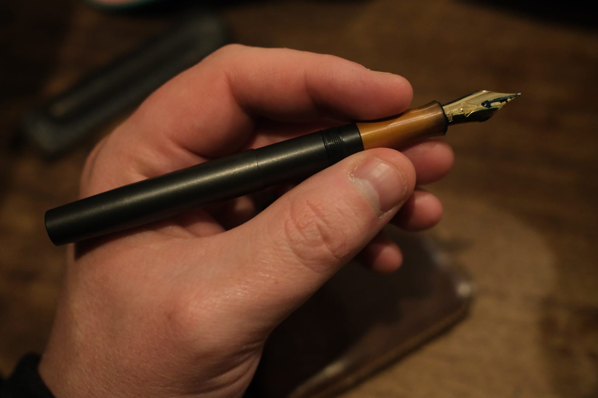 The end result is a pen that takes up zero room in my pocket, and weighs only 24g stock (more with my copper section), but transforms into a comfortable writer at a moment’s notice — one that is always wet, and will never show damage (despite the super thin walls).
