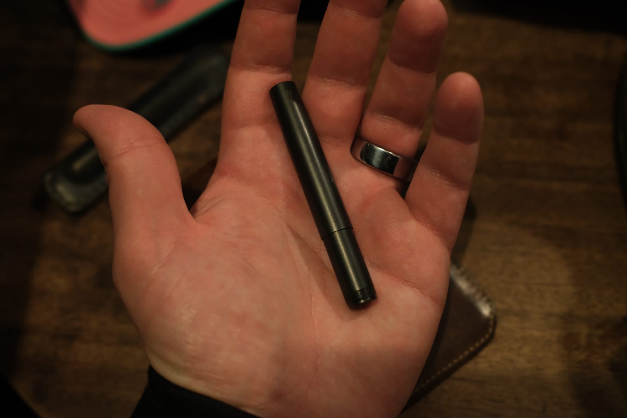 First, it’s fucking tiny. It really is mindblowingly small: it makes a Kaweco Sport look like a giant. And not only is it small, it is really unobtrusive. It has flat ends, no clip, no giant steps or protrusions or facets or buttons. Just a little bit of subtle laser engraving. It is designed purposefully to be small, and it achieves in spades.