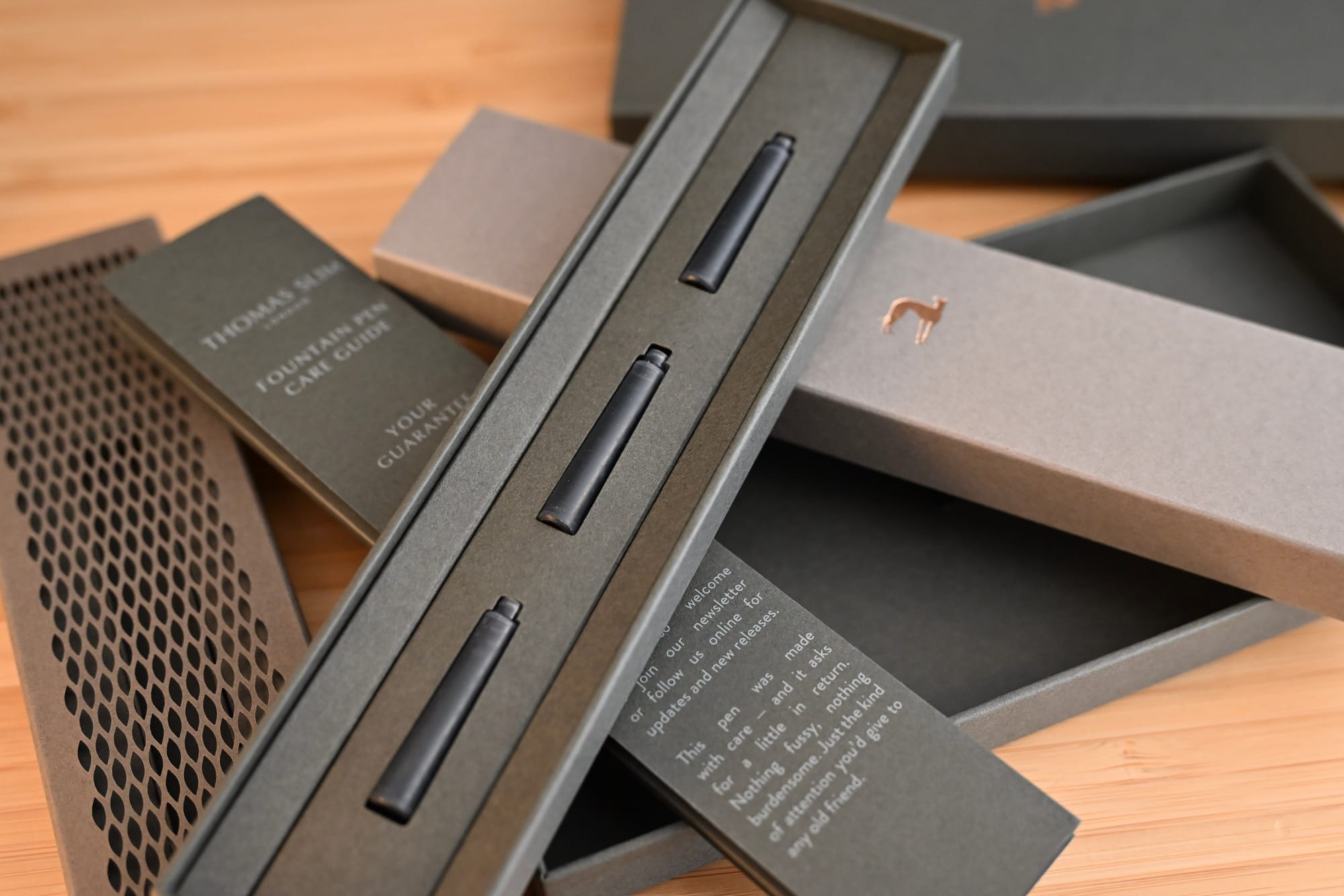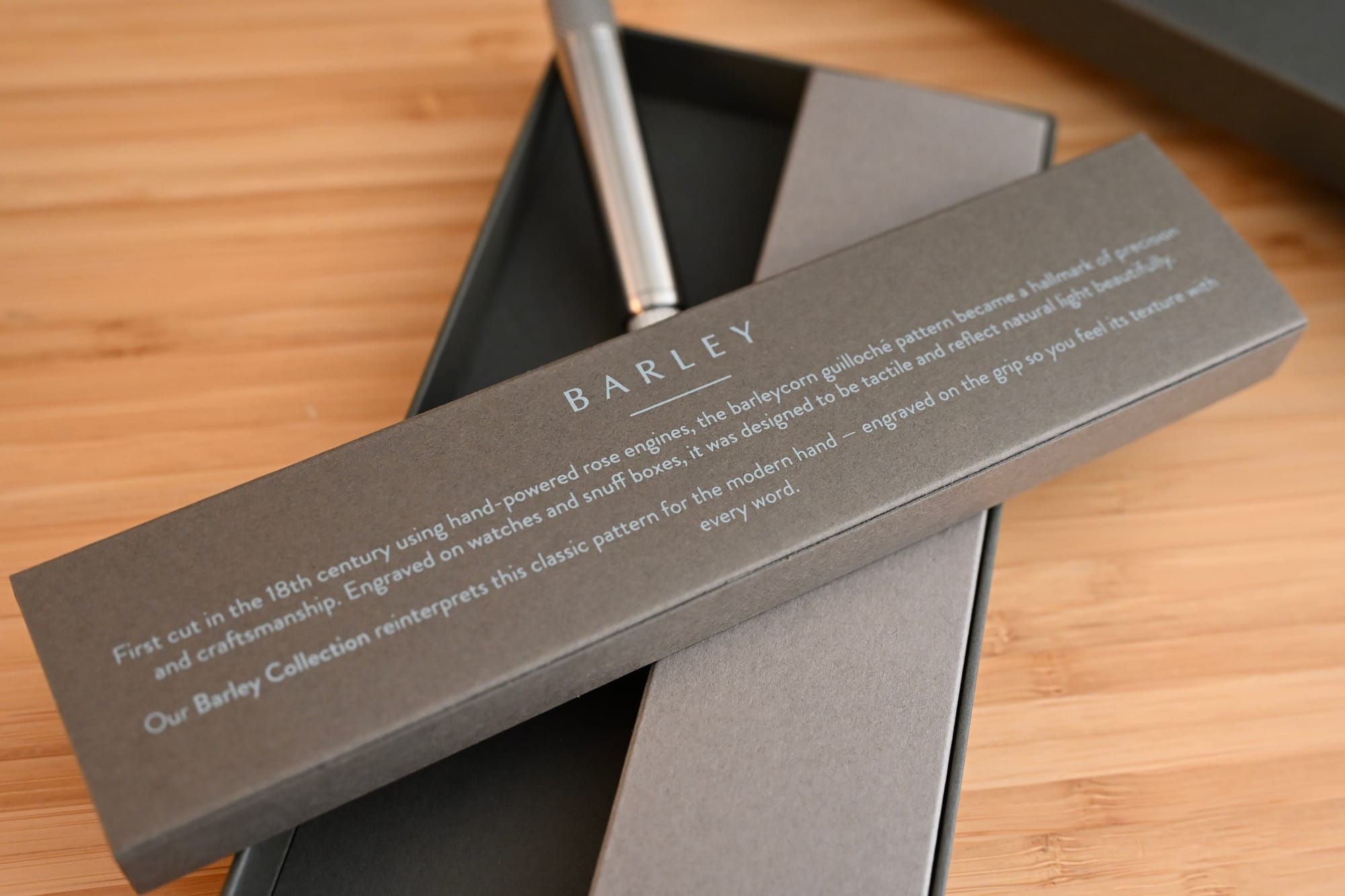 Firstly: packaging. I normally don’t review packaging at all. But in this case it echoes the barley guilloche pattern that occurs across the pen. It’s also just beautifully done, and all from recyclable cardboard. Full marks. This would make a very impressive gift.