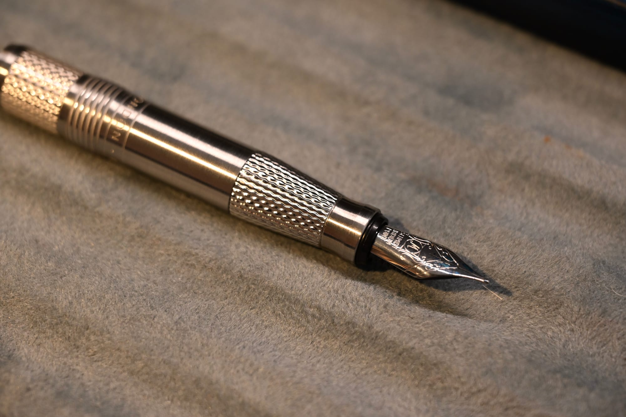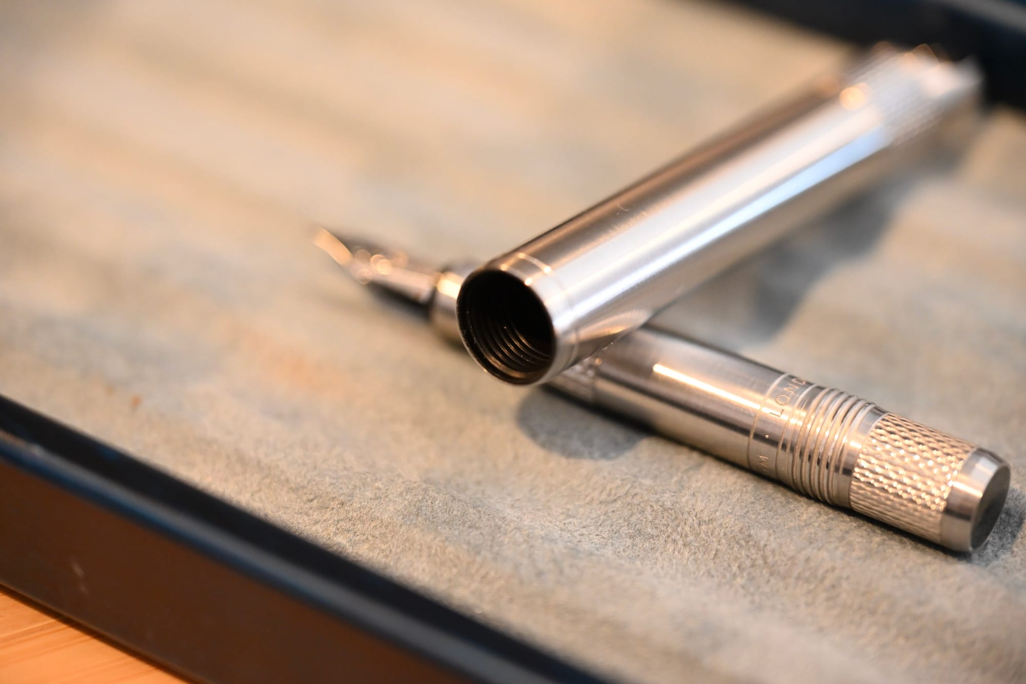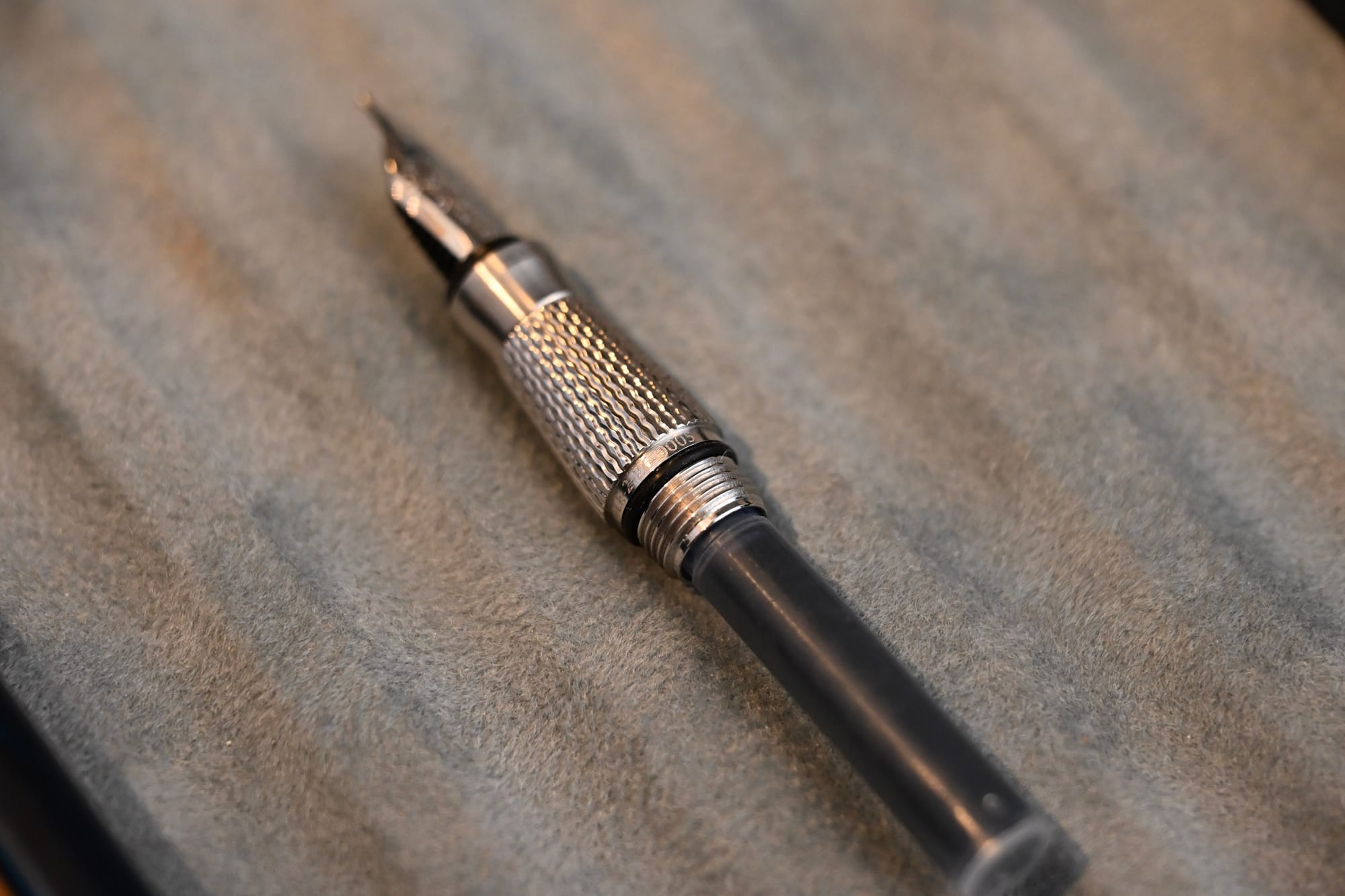 The pen body itself has some tasteful and very nicely done engraving, just next to the acme threads (two and a half turns to uncap and again to post).