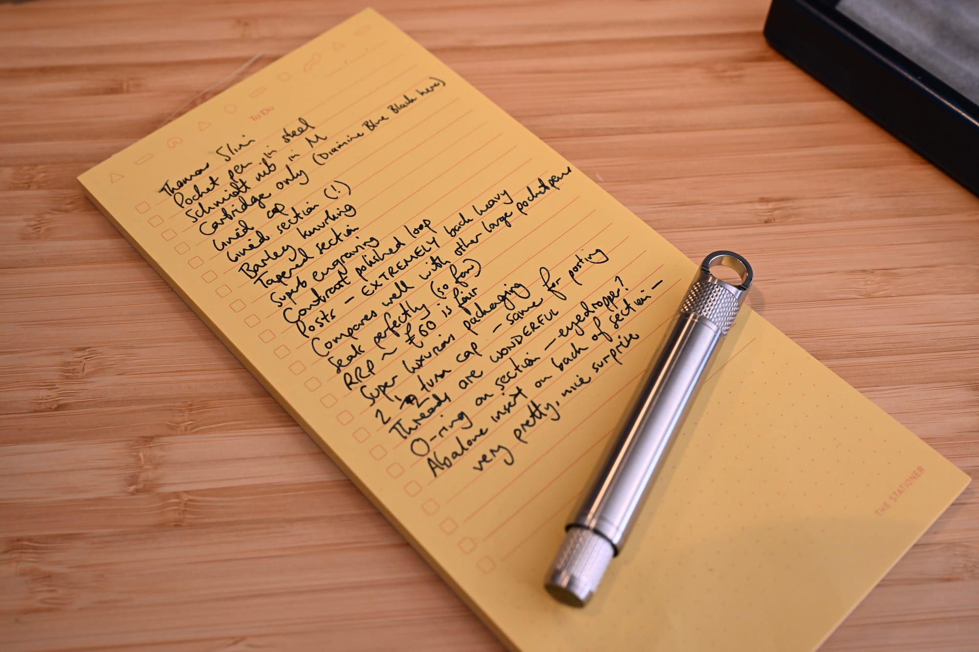 At a projected full retail price of about £60, the Thomas Slim considerably undercuts (just for example) the Gravitas Pocket in stainless steel, and the steel Kaweco Sport. And that’s extremely impressive given the quality packaging, lined cap, lined barrel, o-ring in the section, great threads, abalone insert, variety of machined finishing, etc etc etc.
